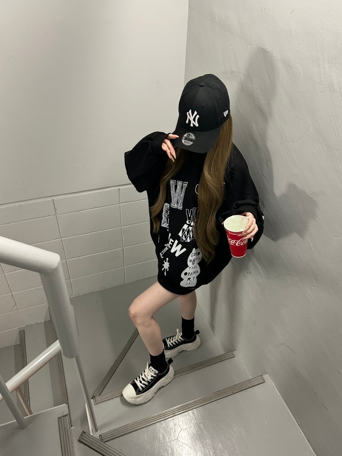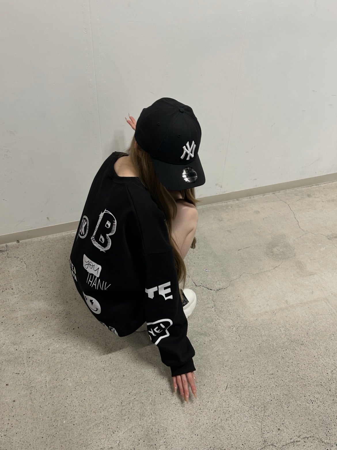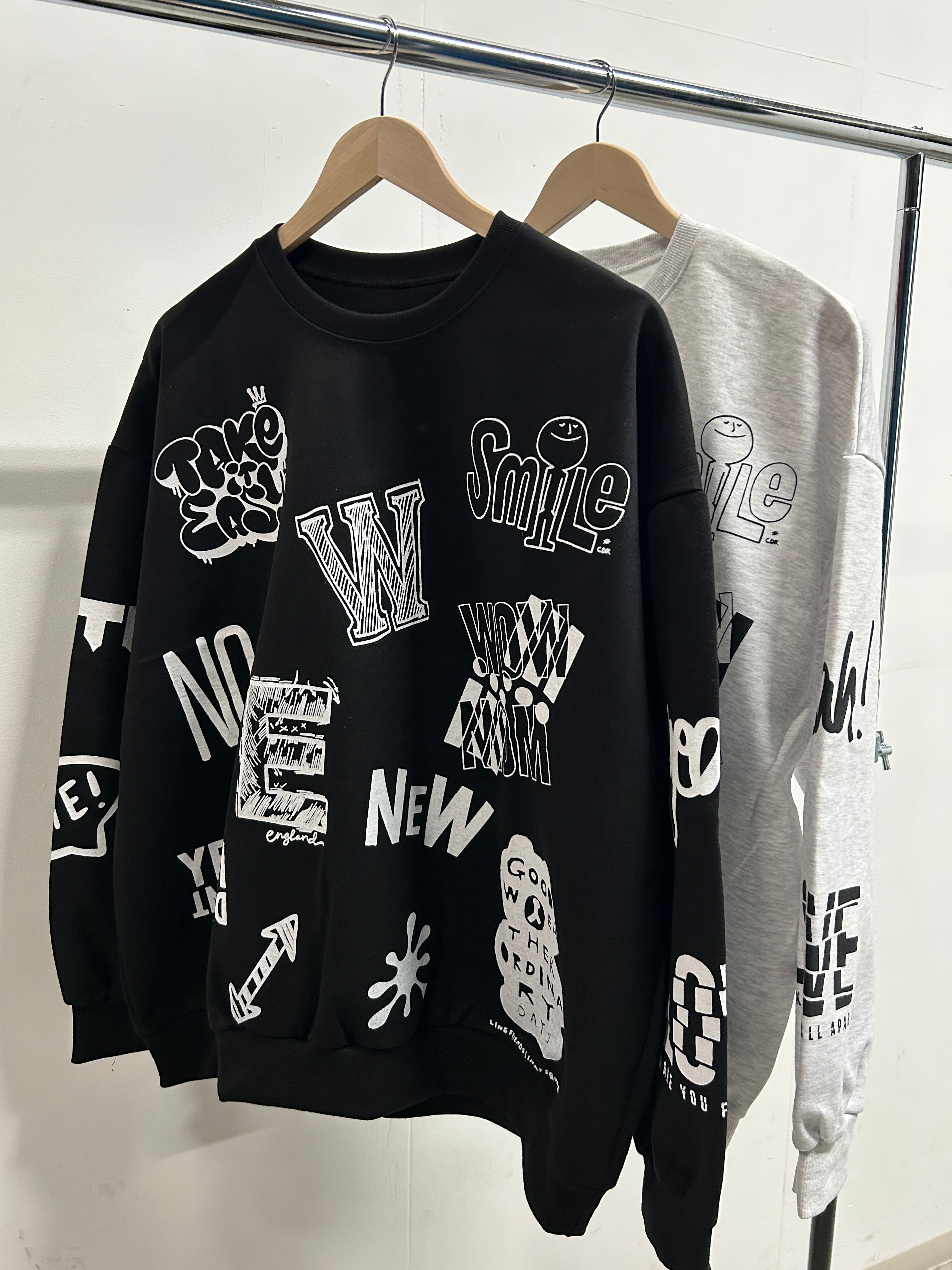 被りにくい落書きのデザインがポイントのオーバーサイズのトレーナーです。